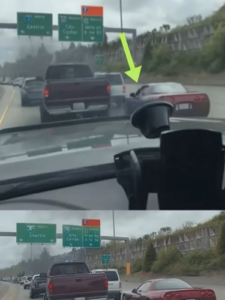 After several blocked attempts, the Corvette driver rolled down his window and gestured aggressively. The gesture—a middle finger aimed at the truck—was both a clear sign of his refusal to yield and an expression of his mounting frustration.