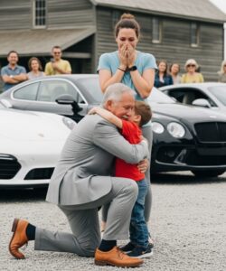But one quiet afternoon, everything shifted. Three polished black cars rolled to a stop outside my worn-out house, and a distinguished older man stepped out. Before I could gather my breath, he lowered himself to his knees on the dusty ground and said, with a trembling voice, “I’ve finally found my grandson.”
