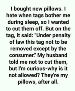 Is it illegal to cut the tag from your pillow? The quick answer is no—if you own it. The scary wording, “UNDER PENALTY OF LAW THIS TAG NOT TO BE REMOVED EXCEPT BY THE CONSUMER,” has frightened several of us mid-snuggle.