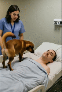His paws clicked softly on the sterile tile, his ears were low, and his gaze shifted between the silent figure on the bed and the medical staff standing nearby. He stopped abruptly at the bedside, tilting his head in confusion and recognition.