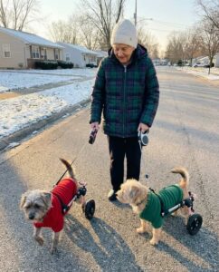 I was taking my usual walk when a neighbor decided my rescue dogs didn’t belong on our street. At 75, I’ve learned to recognize moments that matter, and this was one of them. Pearl and Buddy don’t walk like other dogs—they roll, their tiny wheels clicking softly against the pavement, tails wagging like pure joy on display. Most people smile when they see them. That afternoon, however, one neighbor looked at them with open disgust and told me to get rid of them. In that instant, she didn’t just insult my dogs—she underestimated me.