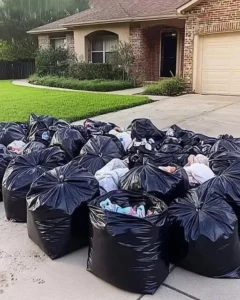 Trash bags spilled over the grass. Toys, clothes, books—Ava’s pink blanket tangled in the bushes.