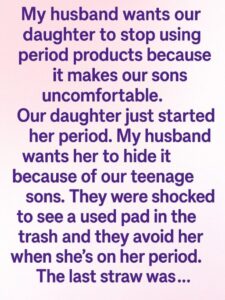 The turning point came one evening when my husband, trying to “solve the awkwardness,” suggested our daughter stay in her room until her cycle ended so the boys wouldn’t feel uneasy.