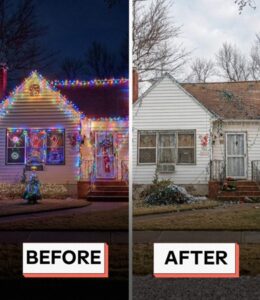 Not crooked. Not half out. Not flickering lazily in the wind. Gone. The roof was bare. The porch rails were empty. Even the wreath I’d carefully wired to the front column had vanished.