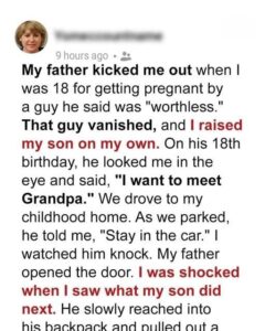 When I was seventeen, a single moment split my life in two: I found out I was pregnant. That truth alone cost me my home, my father’s trust, and the illusion that love was unconditional. Nearly eighteen years later, my son stood on the same porch where I’d once been cast out — and what he said that day would rewrite the ending to a story I thought was closed forever.