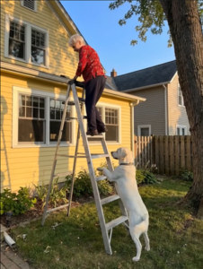 Trying to take control of the situation, I carefully guided him away from the ladder and secured him on his chain near the kennel.