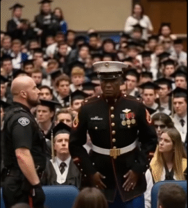Solomon Dryden arrived quietly, not seeking applause — only a moment. Years of duty had taught him humility, and loss had carved wisdom into his eyes. He took his seat among proud families, holding the memory of his late wife and the pride of seeing his son graduate. The high school gym hummed with anticipation, dreams shimmering in the air. Solomon sat tall in his Marine blues — a living emblem of service, sacrifice, and love.When security approached, suspicion flickering where none belonged, Solomon stayed calm. His steady composure, born of discipline, spoke louder than protest ever could. The chatter fell silent, the crowd uneasy — until someone whispered, “He’s a Marine.” The words spread like sunlight through clouds, melting tension into respect.In that instant, six Navy SEAL veterans rose from different corners of the gym. Fathers and uncles of other graduates, they moved with quiet authority, surrounding Solomon in silent solidarity. The guards hesitated, realizing this was not a disturbance — it was a moment of unity.