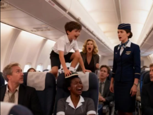 The trouble began shortly after takeoff when Amara, a 22-year-old student heading home to Chicago, felt a series of sharp kicks against the back of her seat. She turned politely to the young boy behind her, hoping for understanding, but the situation quickly escalated. Instead of guiding her son, the boy’s mother dismissed Amara’s request and openly blamed her for the disturbance. When a flight attendant calmly stepped in to help, the mother’s behavior worsened, creating tension throughout the cabin and making other passengers increasingly uncomfortable.