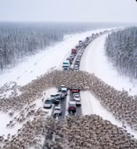 On a quiet highway cutting through a snow-covered forest, hundreds of people were driving home for Christmas, their minds filled with thoughts of gifts and holiday dinners. The atmosphere was peaceful until a low, deep groan echoed from the trees, and a massive flood of thousands of reindeer suddenly burst onto the asphalt. They moved shoulder to shoulder in a relentless wave, driven by a frantic instinct that forced every car to a screeching halt. To the drivers, it looked like a scene straight out of a holiday legend—a breathtaking, once-in-a-lifetime spectacle that many mistook for a Christmas miracle.