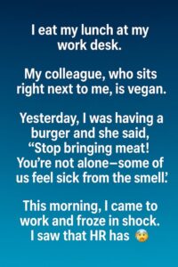 It started with an awkward comment over lunch and ended with an email that made my stomach drop. I usually eat at my desk, so when my coworker—who sits right beside me—asked me to stop bringing meat because the smell made her feel sick, I felt caught off guard and embarrassed. The next morning, I opened my inbox and saw a company-wide message from HR titled “Lunch Etiquette & Shared Workspace Considerations.” The timing felt too perfect to be a coincidence. As I read it, bracing for blame, I realized the message was calm and neutral—just a reminder to be mindful of shared spaces and to communicate respectfully. Still, I couldn’t help but wonder if I had unknowingly become the reason for it.