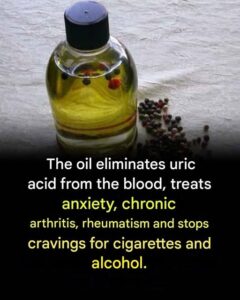 The oil eliminates uric acid from the blood, treats anxiety, chronic arthritis, rheumatism, and stops cravings for cigarettes and alcohol.