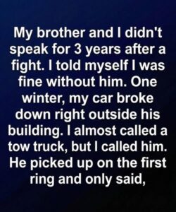 My brother answered on the second ring, his voice holding an effortless familiarity that dismantled three years of guarded suspicion in a single heartbeat. When he emerged from the lobby with jumper cables and a thermos, he didn’t demand an explanation or a list of grievances; he simply brought his unhurried, practical calm to my moment of crisis. We spent the next hour working in the cold, the tension of the lost years melting away under the weight of logistical hurdles and the shared heat of a coffee cup. He stayed with me as a protector, not a judge, proving that the foundation of our brotherhood remained intact beneath the snow-covered sidewalk.