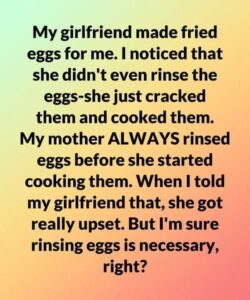 When Evan walked in, still waking up, he casually made a comment about rinsing eggs before cracking them—something he remembered from his childhood.